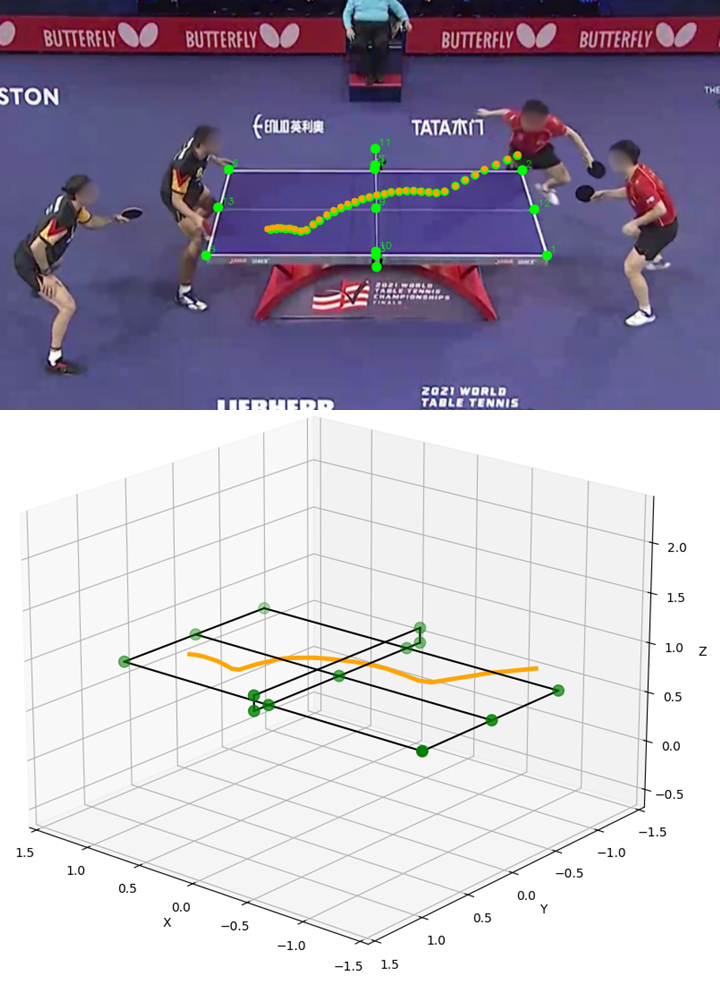 We utilize the Segformer++ architecture to detect the ball and table keypoints in high-resolution images. To train these components, we introduce the TTHQ dataset, which provides abundant 2D supervision. A cross-model filtering strategy effectively removes false positives, such as players' shoes or paddles.